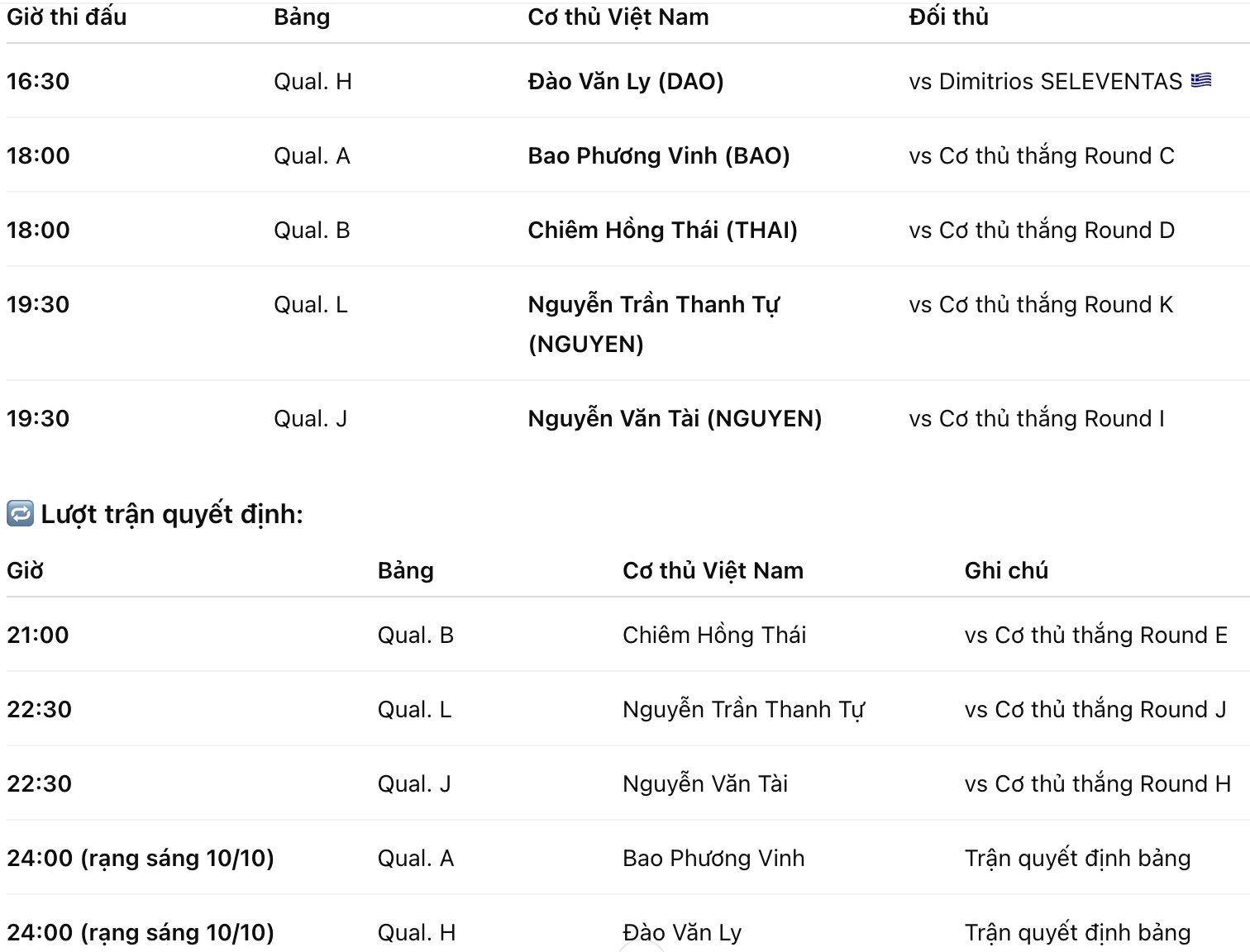 LỊCH THI ĐẤU (ROUND Q) CỦA CÁC ĐẠI DIỆN VIỆT NAM (09/10/2025)