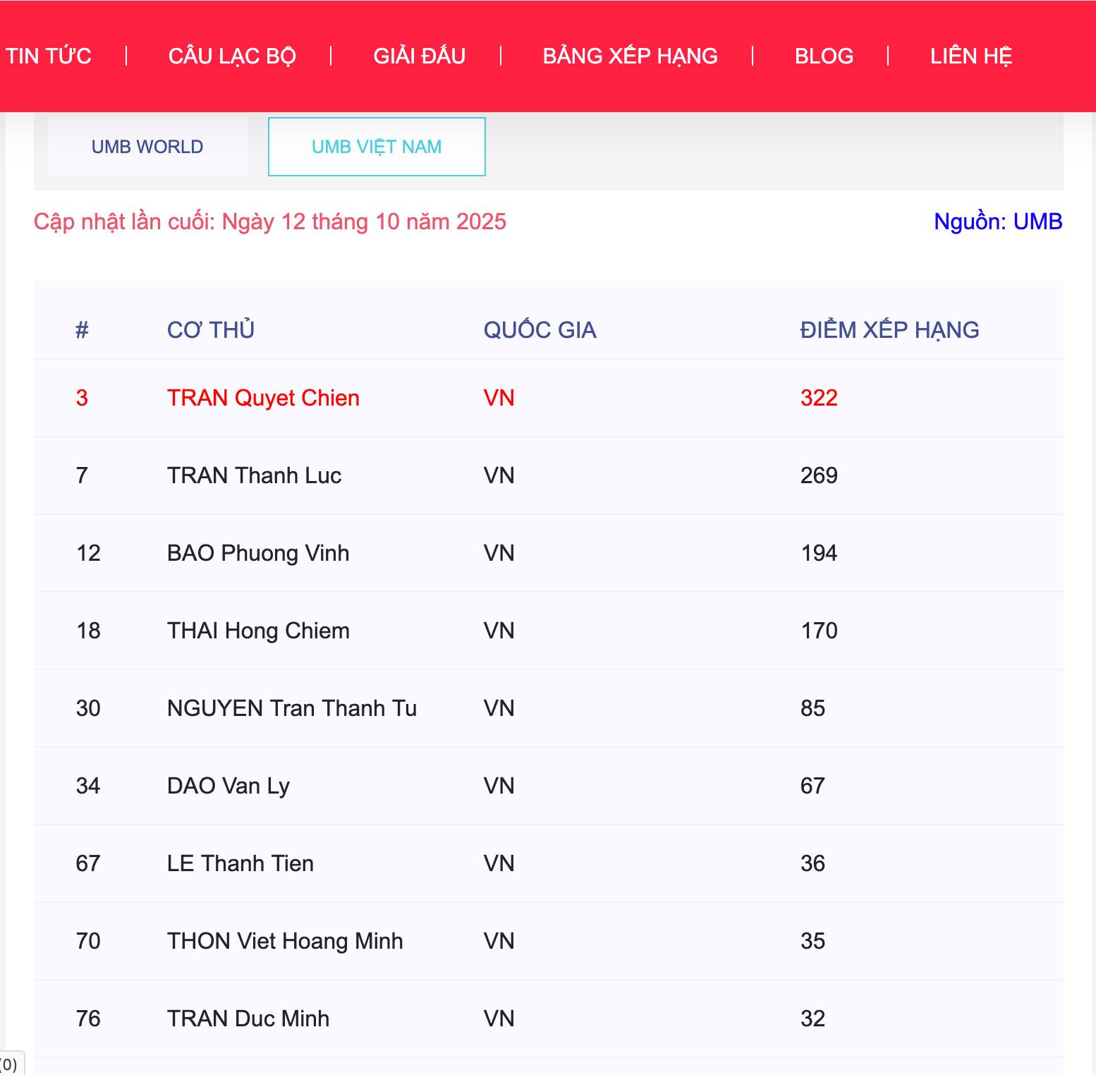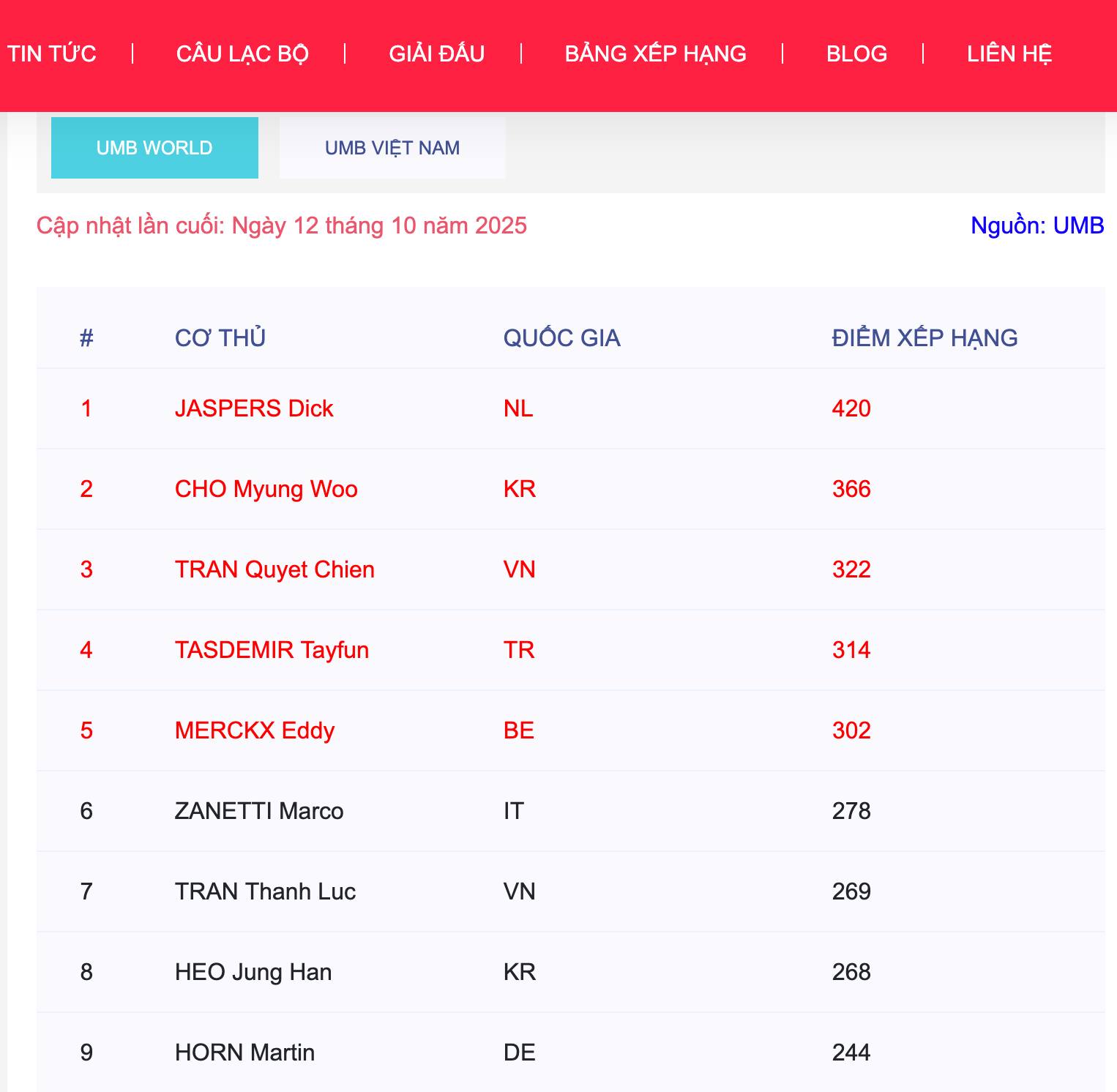 Sau khi Antwerp World Cup 2025 khép lại, bảng UMB World Players Ranking đã có những biến động đáng chú ý, đặc biệt là sự thăng tiến mạnh mẽ của Bao Phương Vinh và phong độ ổn định của Trần Quyết Chiến.